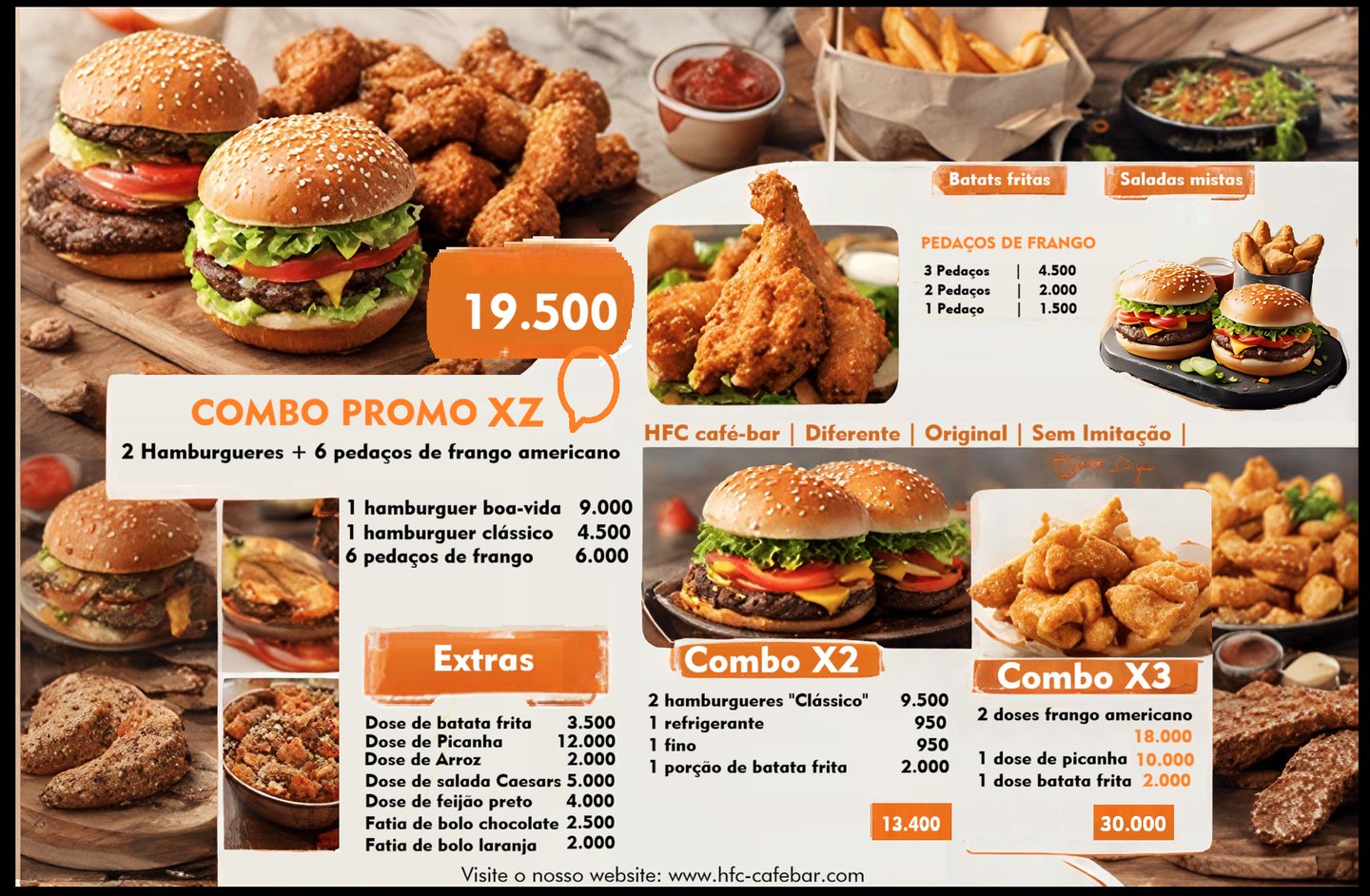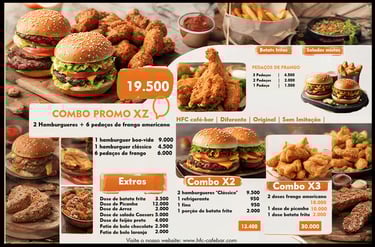 Bem-vindo ao menu do HFC Café Bar! Aqui, a comida rápida (fast-food) ganha um toque inconfundível de sabor caseiro e preparo artesanal. Desde os nossos suculentos hambúrgueres e saborosos grelhados até o autêntico churrasco de frango na brasa, tudo é feito com ingredientes frescos e muito carinho.